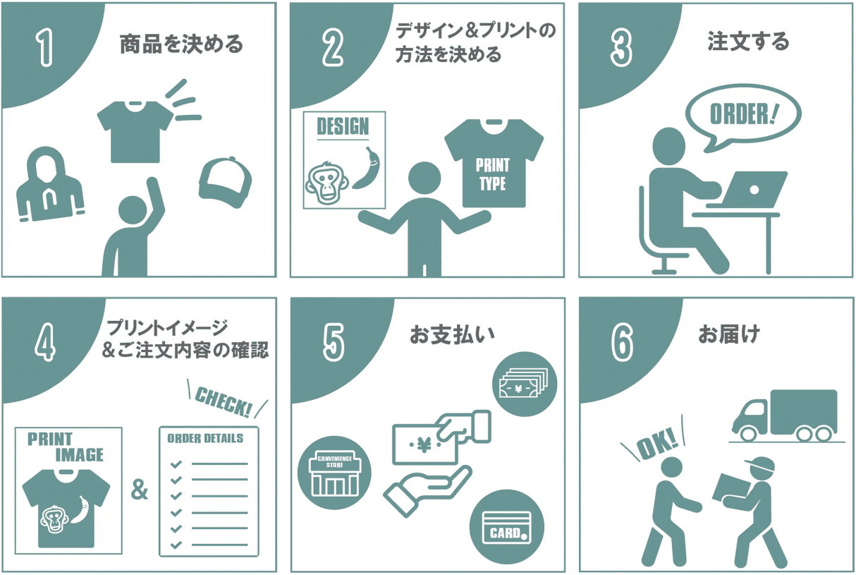- ステップ6:納品 指定の場所に納品されたら、すぐに数量確認をします。デザインに問題がないか、プリントのズレや色ムラがないかもチェックします。